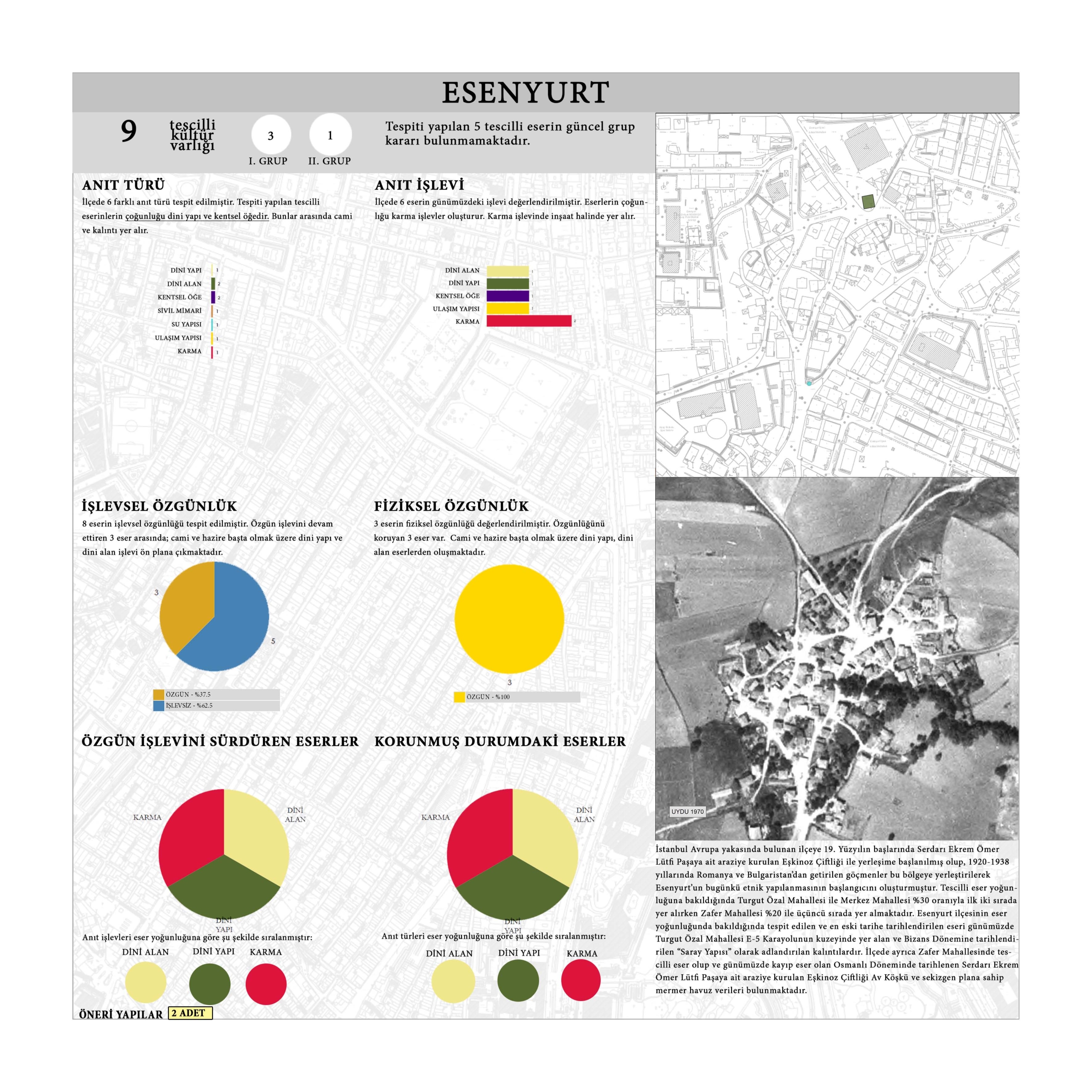 Esenyurt’un bugünkü etnik yapılanmasının başlangıcını oluşturmuştur. Tescilli eser yoğunluğuna bakıldığında Turgut Özal Mahallesi ile Merkez Mahallesi %30 oranıyla ilk iki sırada yer alırken Zafer Mahallesi %20 ile üçüncü sırada yer almaktadır. Esenyurt ilçesinin eser yoğunluğunda bakıldığında tespit edilen ve en eski tarihe tarihlendirilen eseri günümüzde Turgut Özal Mahallesi E-5 Karayolunun kuzeyinde yer alan ve Bizans Dönemine tarihlendirilen “Saray Yapısı” olarak adlandırılan kalıntılardır. İlçede ayrıca Zafer Mahallesinde tescilli eser olup ve günümüzde kayıp eser olan Osmanlı Döneminde tarihlenen Serdarı Ekrem Ömer Lütfi Paşaya ait araziye kurulan Eşkinoz Çiftliği Av Köşkü ve sekizgen plana sahip mermer havuz verileri bulunmaktadır.